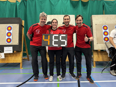 Zeitgleich in der gleichen Halle fand der 1./2. Wettkampftag der Südbaden Liga Recurve statt. Hier startete die 1. Mannschaft der BSFD mit Erwartungen auf den Sieg. In einem ebenfalls sehr ausgeglichenen Feld unterlag man nur sehr knapp und erreichte den 2. Platz.
